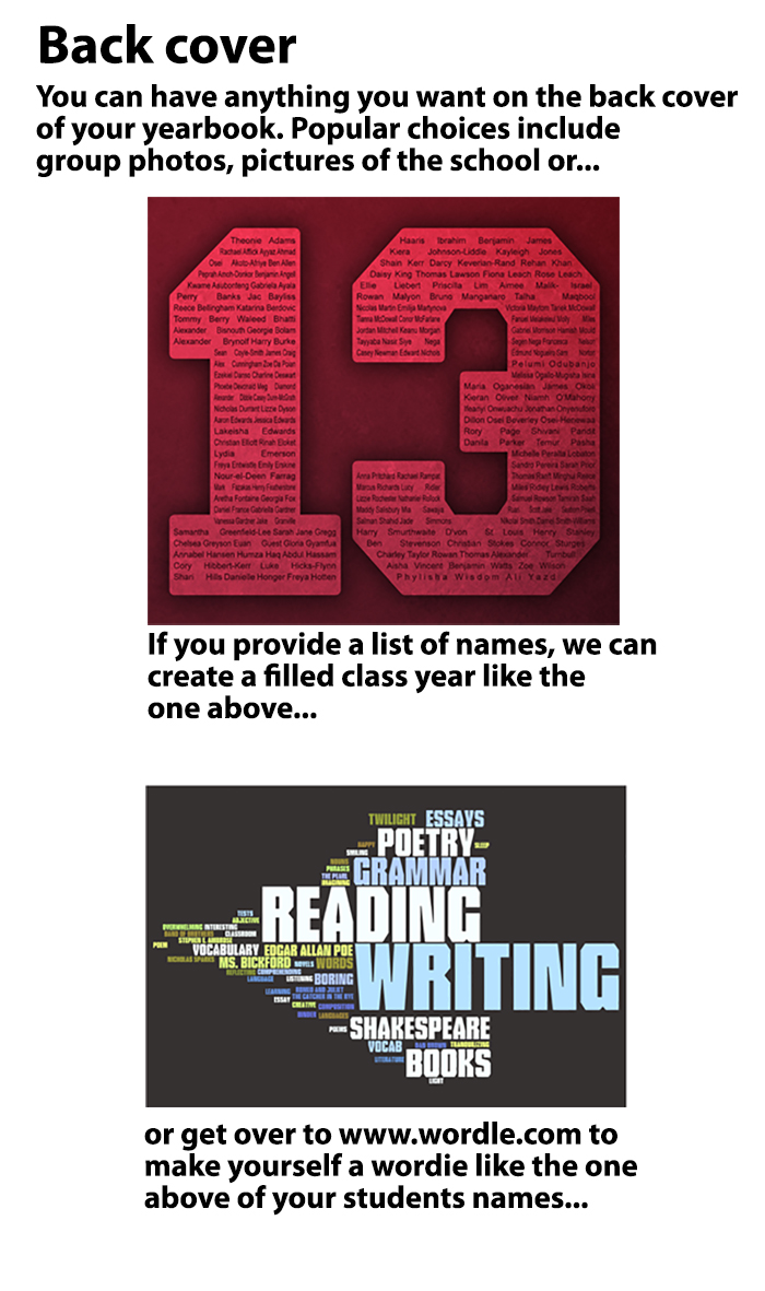 Tell us your ideas: by email, or by using the “Cover & Endpapers” button on the “Design & Manage Yearbook” tab.